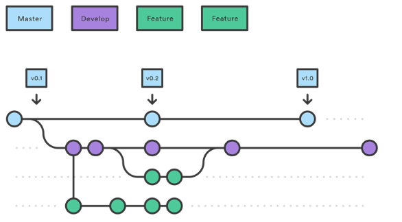 - Vincent Driessen이 그의 블로그에 2010년 올린 "A successful Git branching model" 글의 브랜치 전략.